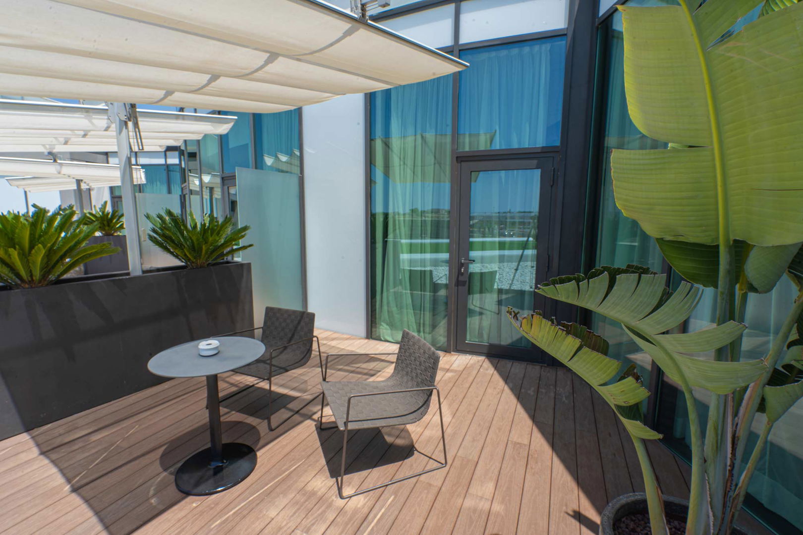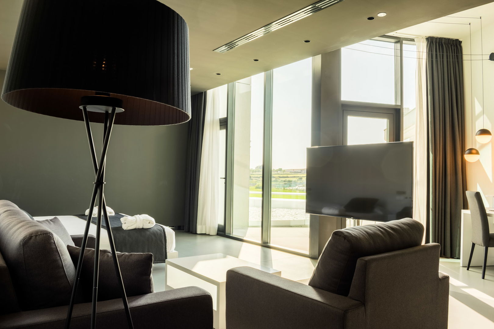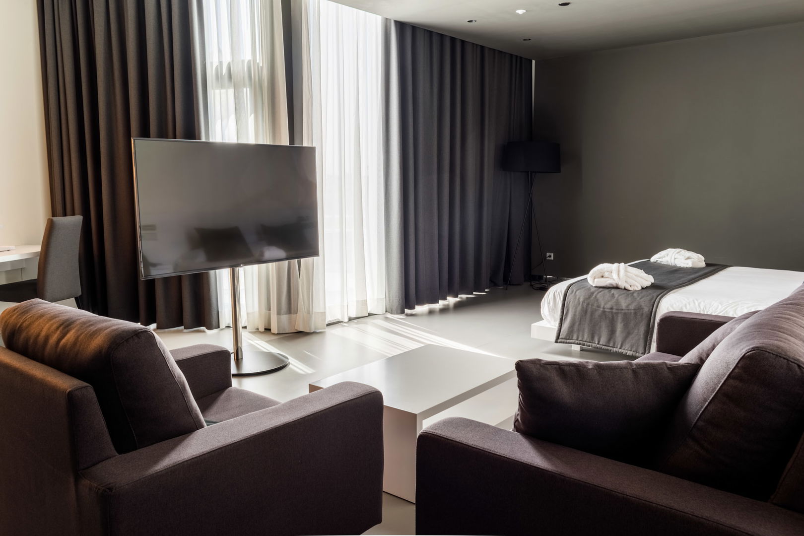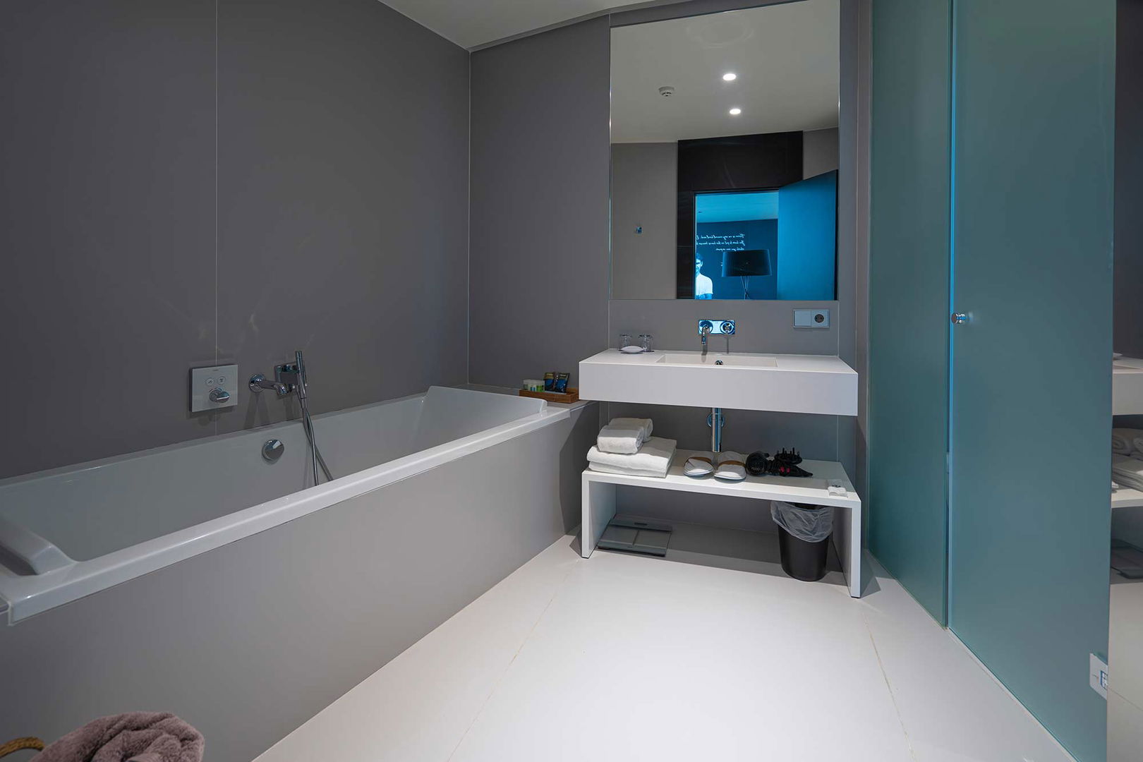 Enjoy free WIFI, a flat TV screen and a variety of amenities such as a mini bar, robes and slippers. You also get free access to our 3,000m2 fitness centre with Technogym machines, semi-Olympic indoor pool, outdoor pool and an exclusive Spa with a hydrothermal circuit, sauna and steam bath.