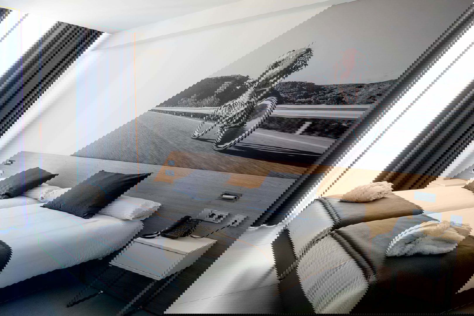 Rest in our standard room with two twin beds, functional furniture, natural light and a sport design that takes your breath away as you enter.