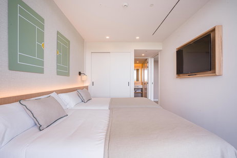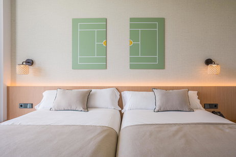 Descansa en nuestra habitación estándar con dos camas de matrimonio, mobiliario muy funcional, una agradable luz natural y un diseño deportivo que sorprende nada más entrar.